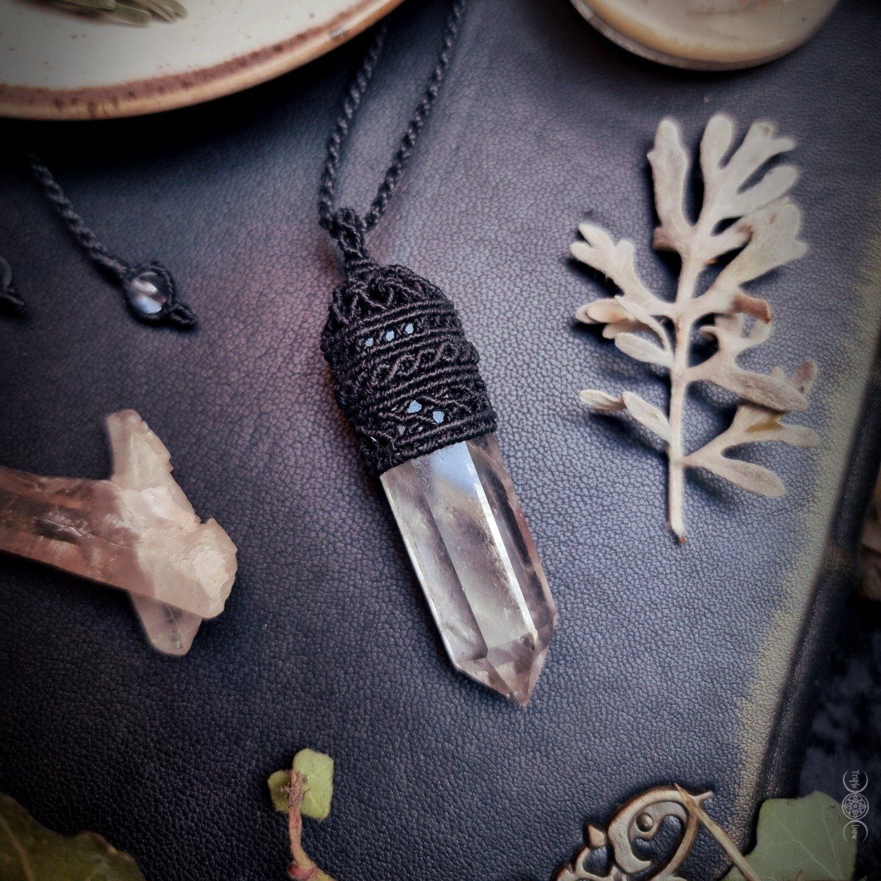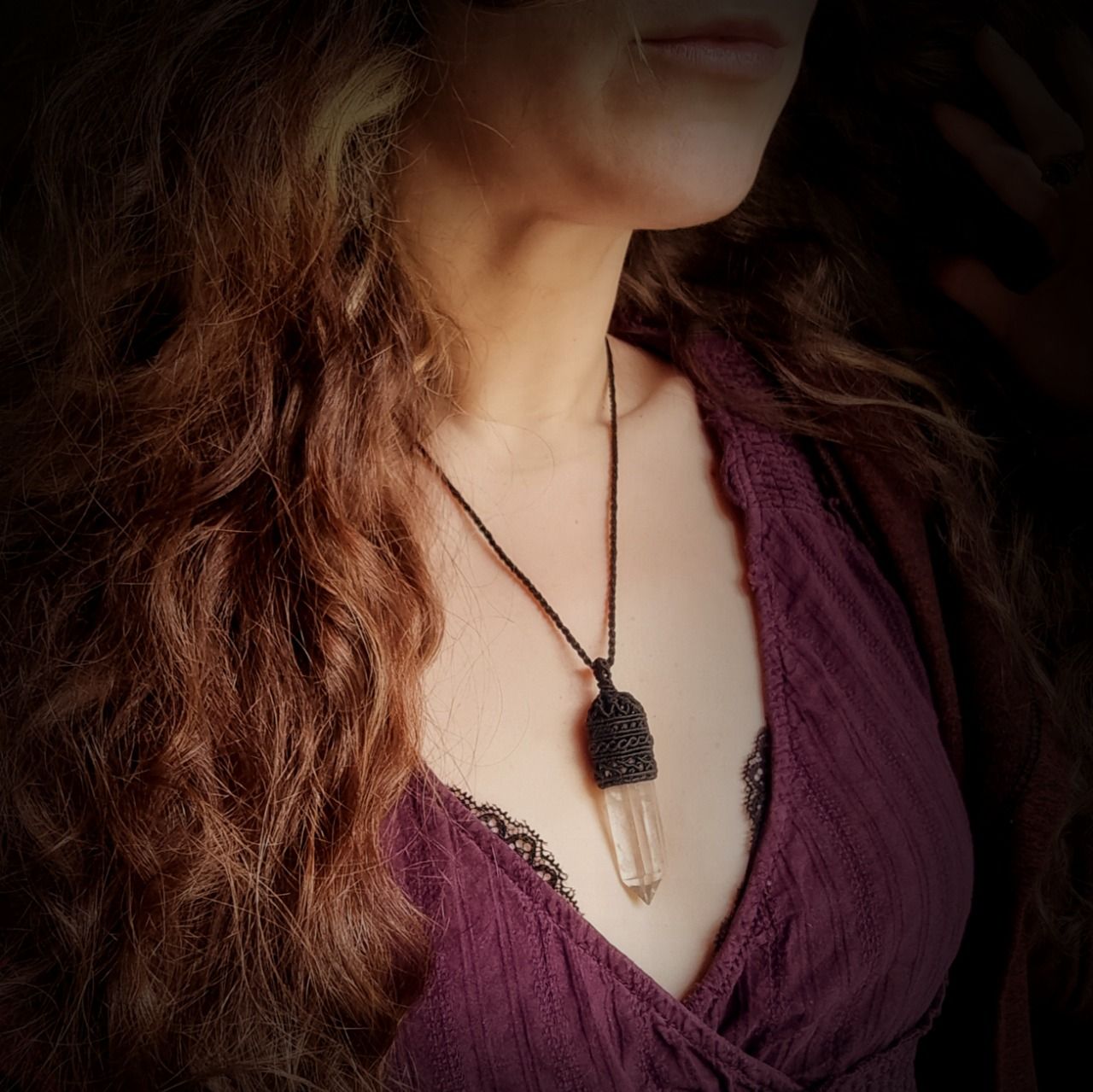 Un talisman protecteur doublé d'un pendule, tissé en osmose avec une pointe de quartz fumé.