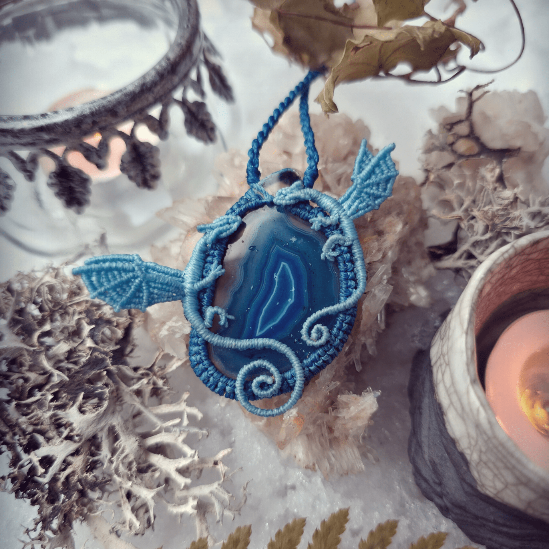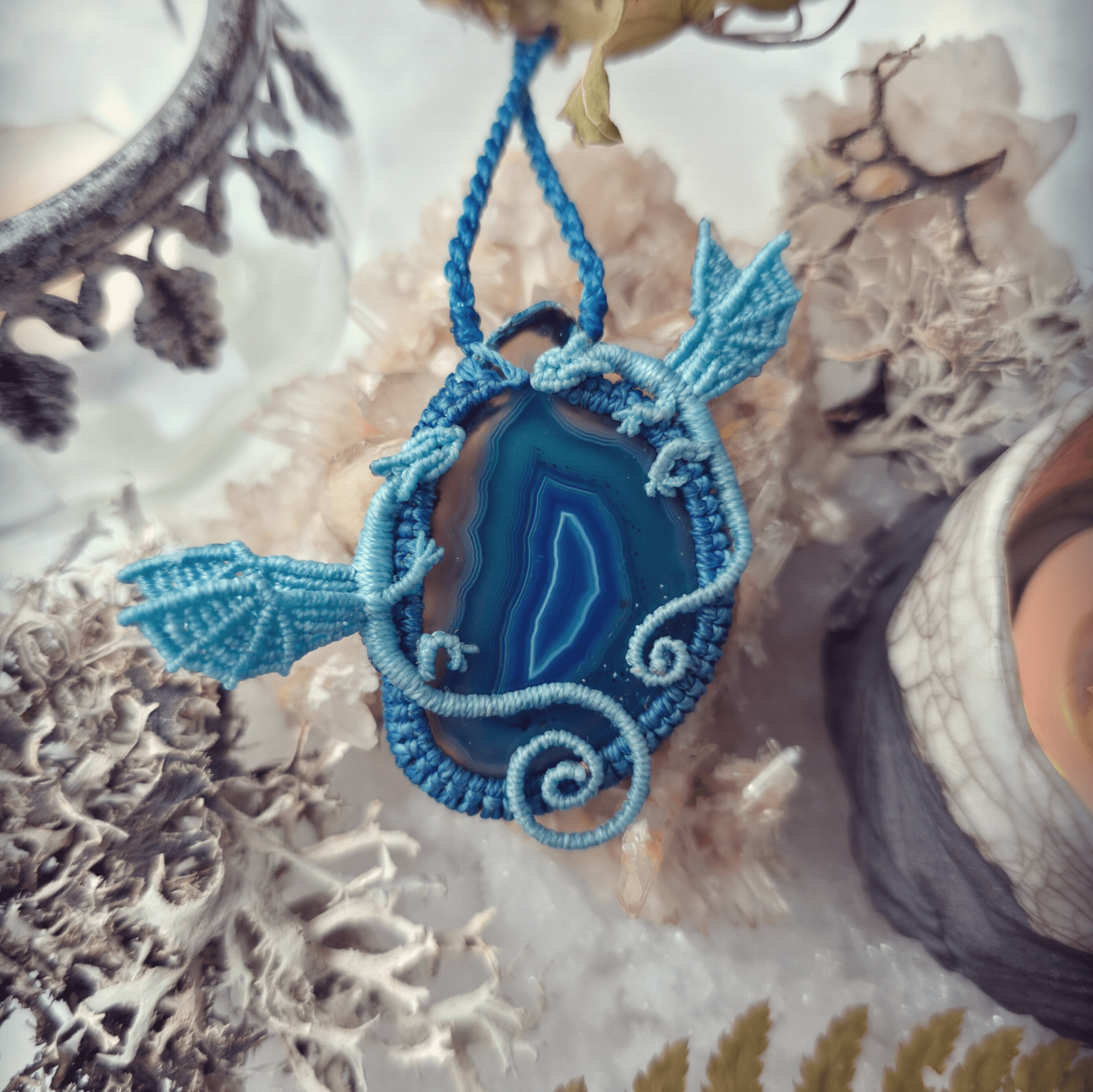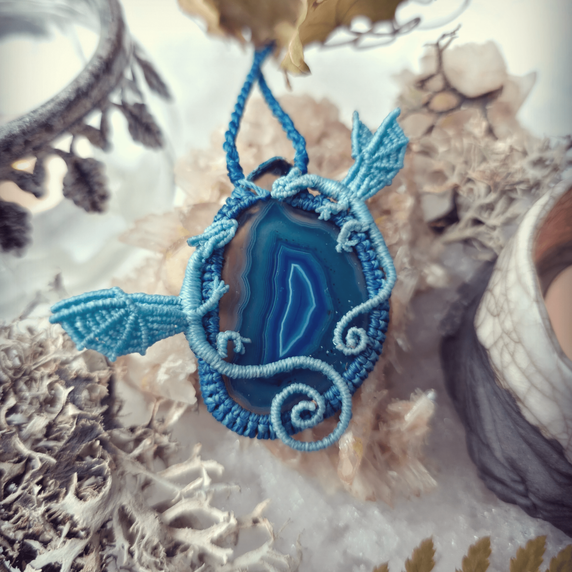 Composition : Agate teintée, fil Linhasita couleur Bleu Clair [398] et Bleu Lapis [298], acier inoxydable.